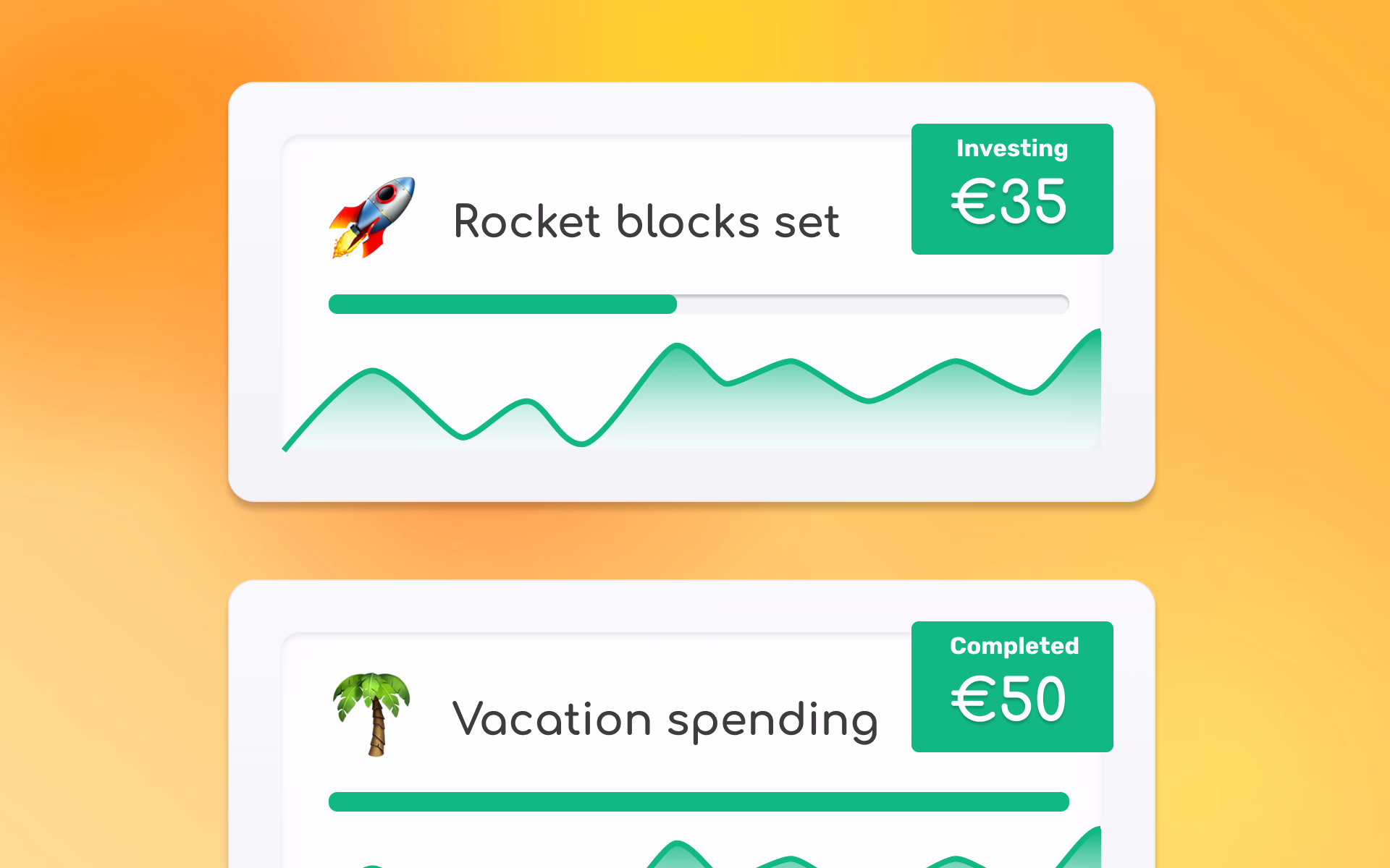 Safe market simulation. Goals that rise and fall like real investments. They learn patience and compound growth without risk.